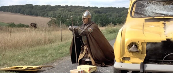 Návštevníci“ (1993) je slávna (mimochodom vynikajúca!) francúzska komédia v hlavnej úlohe so Jeanom Renom o stredovekom rytierovi, ktorý sa po očarovaní dostane do súčasnosti. Prechádzajúc sa v brnení pôsobí spolu so svojím spoločníkom v uliciach moderného Francúzska nielen podivne, ale predovšetkým stratene. A všetko ho desí: autá, lietadlá, telefóny… Na rozdiel od moderných Francúzov si však aspoň zachová svoju úprimnú katolícku vieru a hrdinské spôsoby. Ako v každej správnej starej rozprávke“, i tu sa nakoniec rytier stretáva so svojou milou.