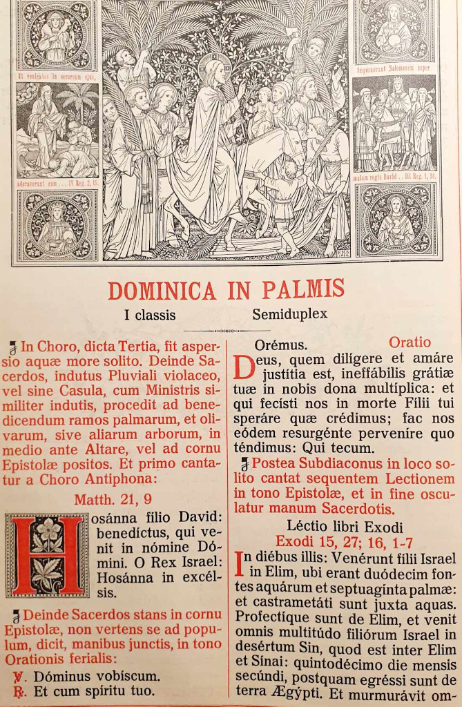 Takto krásne nás vovádza do problematiky Palmovej nedele malý latinsko-slovenský misál. Ja si dovolím v tejto téme pokračovať a nadviazať tak na moju staršiu sériu článkov o Veľkom týždni, pričom budem aj tentokrát opisovať liturgiu spred reforiem Veľkého týždňa, ktoré sa uskutočnili v roku 1955 pod „taktovkou“ pápeža Pia XII. V tejto súvislosti si spomenieme aj zásadné rozdiely, ktoré v liturgii Palmovej nedele nastali reformou pápeža Pia XII.