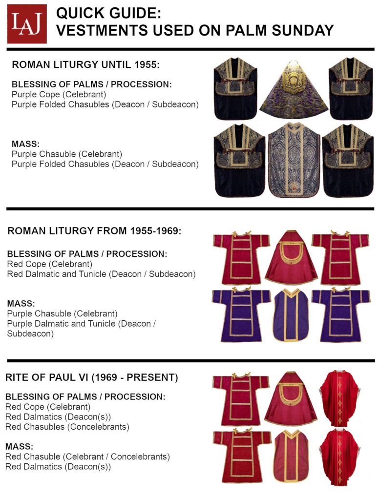 Použitie červenej na požehnanie paliem a procesiu nedáva skrátka zmysel, pretože červená farba bola i je liturgicky vyhradená hlavne pre dni, kedy bola preliata krv mučeníkov. Prečo by sa teda mala používať červená, keď Ježiš ešte nebol umučený? Na Palmovú (kvetnú) nedeľu po roku 1955 si okrem toho subdiakon a diakon obliekajú tuniku a dalmatiku, teda dve rúcha radosti. Palmová nedeľa však nie je dňom obrovskej radosti, ale skôr začiatkom veľkej bolestnej obety Boha na kríži. Na to sa takáto symbolika radosti javí ako celkom nevhodná.
