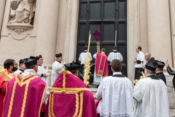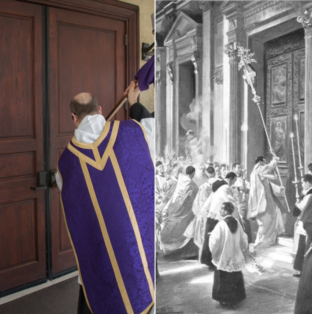 Klérus a veriaci ľud vonku refrén spevom zopakuje. Kantori pokračujú a spievajú ďalšie verše hymnu a tí, čo sú vonku, opakujú refrén po každom verši. Po odspievaní prichádza na scénu krásna ceremónia. Subdiakon (v nižšom stupni omše krucifer), niekde aj sám kňaz, trikrát zaklope rukoväťou procesiového kríža na chrámové dvere. Kantori vo vnútri dvere otvoria a procesia vstupuje do chrámu. Je to silný a dojemný obrad, o ktorom pápež Benedikt XVI. povedal na homílii Kvetnej nedele (2007) nasledovné: