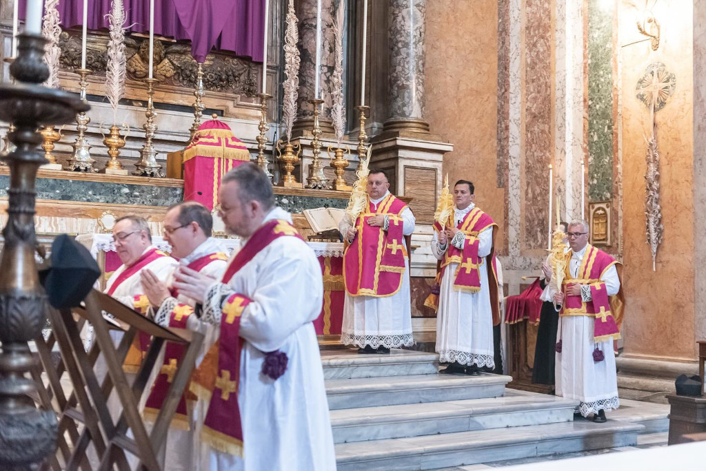 Keď procesia vstúpi do svätyne, kňaz si zloží pluviál a oblečie si ornát. V stupňovej modlitbe sa vynecháva žalm 42 Iudica me. Omša ďalej prebieha štandardne, Glória pred modlitbou dňa sa klasicky vynecháva, ako je tomu v čase pôstu. V epištole, ktorú v slávnostnej omši spieva subdiakon, sa v časti „et donavit illi nomen, quod est super omne nomen“ spoločne pokľakne.