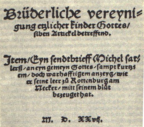 Raní anabaptisti formulovali svoje presvedčenie vo vyznaní viery v roku 1527 nazvanom Schleitheimské vyznanie. Jeho autor Michael Sattler bol krátko nato zatknutý a popravený. Anabaptistické skupiny sa výrazne líšili vo svojich konkrétnych presvedčeniach, ale Schleitheimské vyznanie predstavuje základné anabaptistické presvedčenia pomerne dobre.