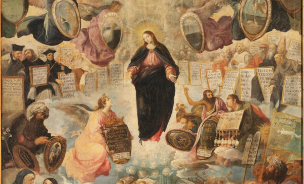 Keď Boh maľuje Pannu, ktorá stojí na ruži („rosa mystica“ z Loretánskych litánií), svätí Joachim a Anna, jej rodičia, držia pre neho plátno. Medzi nimi anjel spútava diabla, zatiaľ čo ďalší anjeli pripravujú pre Boha farby z hmoty tohto sveta a podávajú mu ich do Neba. Iní anjeli prinášajú Máriinu korunu a žezlo, iní korunu z dvanástich hviezd z Apokalypsy a ľaliu, symbol čistoty. Anjel v pravom hornom rohu drží stuhu s veršom zo Žalmu 45, ktorý sa číta na ranných modlitbách mariánskych sviatkov: „Poďte a pozrite sa na Božie diela.“
