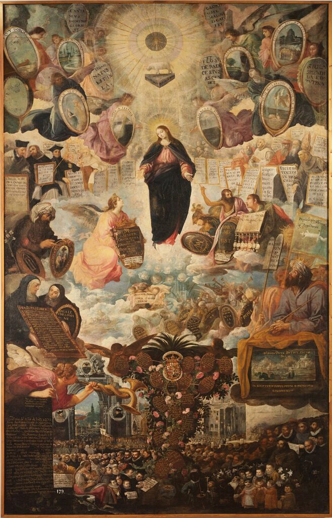 Existuje jasnejší príklad od plodného španielskeho maliara Vicente Juana Masipu, známeho aj ako Juan de Juanes (1507 – 1579), je spomenutý vyššie. Najsvätejšia Trojica korunuje Pannu Máriu odetú v bielom a modrom, stuhy po stranách uvádzajú jeden z najčastejšie používaných biblických citátov o Nepoškvrnenom počatí, Pieseň piesní: „Celá si krásna, priateľka moja, a škvrny na tebe niet.“ Ďalšia stuha sa rozvíja pri jej nohách: „krásna ako mesiac“ a po stranách je osem symbolov: „vyvolená ako slnko“, „hviezda morská“ (z mariánskej hymny pri vešperách) a pod.