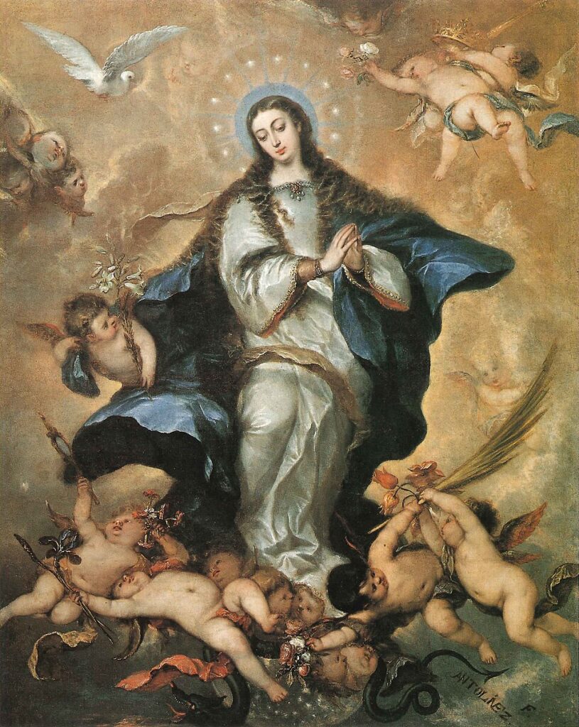 Mexický umelec Baltasar de Echave Ibía (cca 1585 – 1644), ktorý sa zjavne dostal k množstvu modrej farby, spracoval slová z knihy Genesis: „Nepriateľstvo položím medzi teba a ženu, medzi tvoje potomstvo a jej potomstvo“, a inšpiroval sa drakom z Apokalypsy. Tento motív dnes považujeme za samozrejmý, no formálne bol začlenený do rímskej liturgie až blahoslaveným Piom IX., keď v roku 1863 vydal nové ofícium Nepoškvrneného počatia.