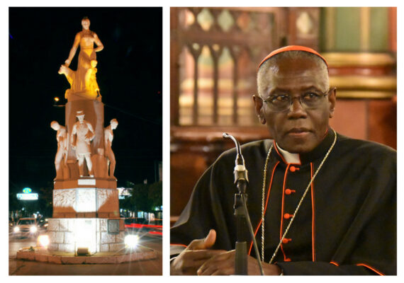 Ilustračný obrázok: vľavo monument pachamamy, vpravo kardinál Sarah