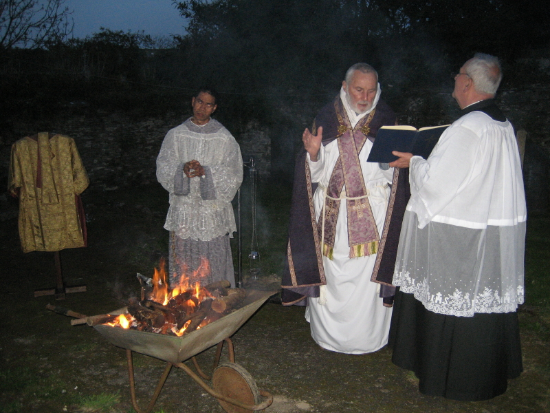 202. Aké špeciálne požehnania predchádzajú liturgii Bielej soboty? Pred dverami kostola idú celebrant a diakoni na miesto pripravené na požehnanie nového ohňa a kadidla. Oheň predstavuje Krista, ktorý vstal z hrobu pred bránami Jeruzalema, preto sa oheň požehnáva mimo kostola.