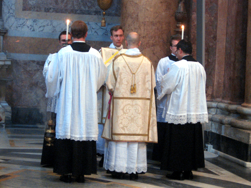 209. Čo sa deje bezprostredne po Litániách? Kým diakoni spievajú posledné „Kyrie eleison“, celebrant vystupuje k oltáru oblečený v bielom rúchu. Incenzuje oltár a intonuje „Glória“, potom zazvonia zvony, organ zahrá a v kostole sa rozsvietia svetlá.