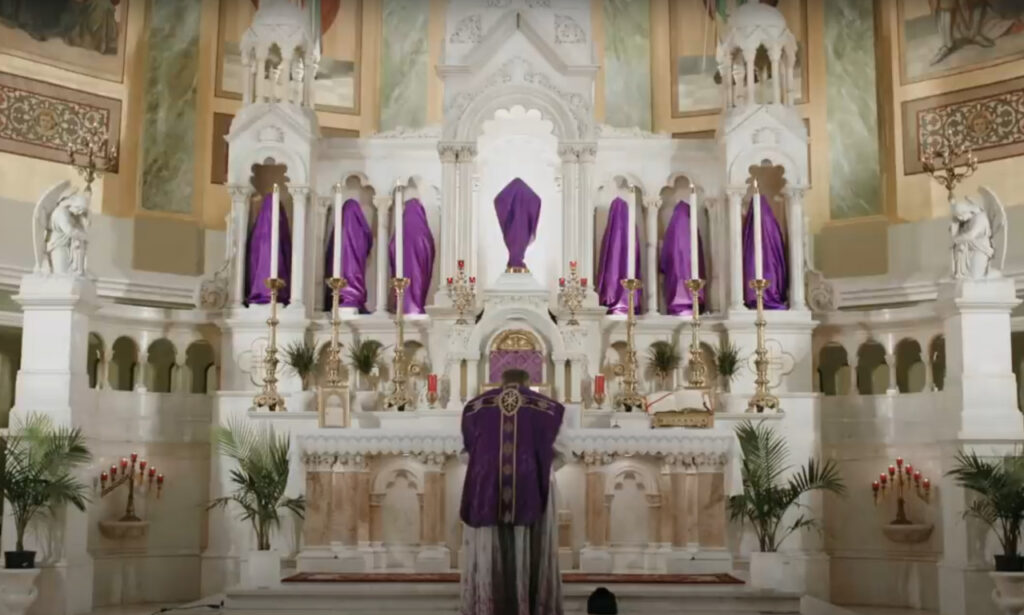 176. Ako nás Cirkev pripravuje svojou liturgiou na slávenie umučenia vo Veľkom týždni? Už sa nehovorí „Gloria Patri“. Večerné ofícium spieva Jeremiášove lamentácie. Fialové rúcha sa na Veľký piatok menia na čierne. Kríže sú zakryté a sochy a obrazy tiež.