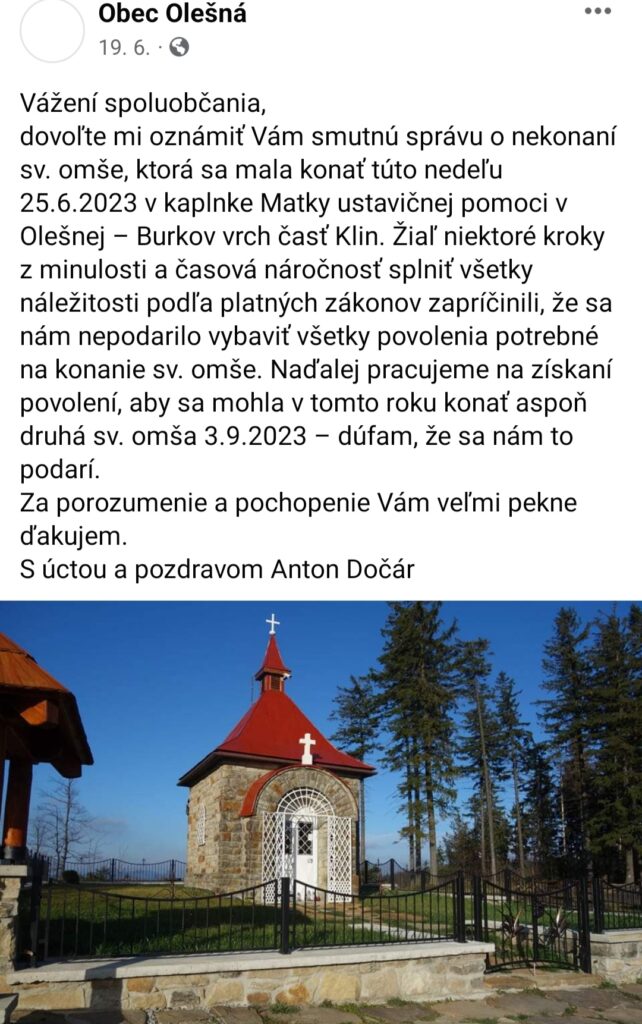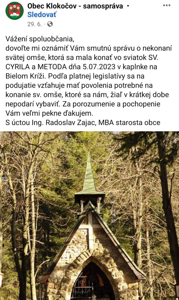 „Podľa platnej legislatívy sa na podujatie vzťahuje mať povolenia potrebné na konanie sv. omše, ktoré sa nám, žiaľ v krátkej dobe nepodarí vybaviť.“