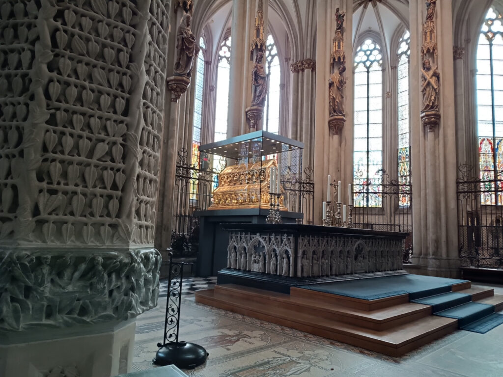 Poslednou zástavkou je srdce katedrály – relikviár s pozostatkami troch mudrcov. Kde by mohla skončiť takáto púť, ak nie pri pútnikoch par excellence?