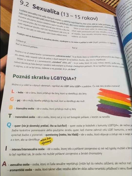 Vo verzii pre deti vo veku od 10 do 15 rokov, časť „9.2 Sexualita (13 – 15)“, sme našli vysvetlivky skratiek LGBTIQA+. Trochu veľa písmen na náš vkus, ale chápeme, že kvôli všeobecnému rozhľadu je dobré poznať ich význam. Schuti sme sa síce zasmiali na genderovo korektnom jazyku v učebnici, nuž ale dobre. Toto nechajme bokom. Čakajú nás totiž iné „zaujímavosti“. Kapitola s názvom „Prvý sex“ napríklad.