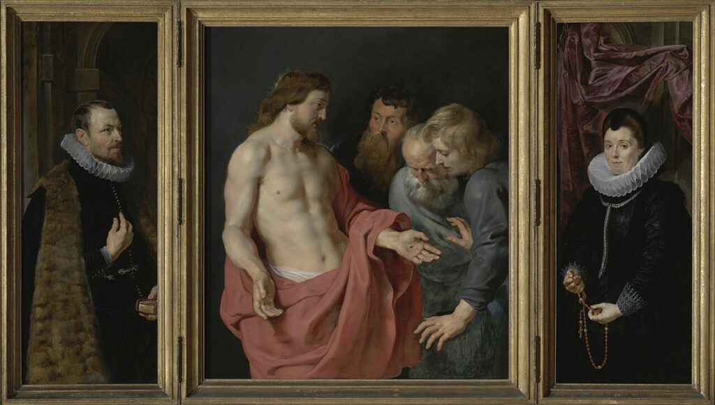 Pri tomto obraze by som upozornil na jeden zaujímavý fakt. Rubens ponecháva na Kristovom oslávenom tele rany po klincoch na dlaniach a nohách zámerne, pretože tie majú v kresťanskej teológii odlišný význam, než rana na boku chápaná ako fyzický dôkaz pre Tomáša. Stopy po klincoch sú totiž tradične chápané ako znaky víťazného utrpenia, ktoré Kristus nezakrýva ani po Zmŕtvychvstaní, ale nesie ich ako trvalé svedectvo vykúpenia. Nejde už o otvorené zranenia vyzývajúce k dotyku, ale o viditeľné „insígnie“ obety, ktoré potvrdzujú kontinuitu medzi ukrižovaným a vzkrieseným Kristom.