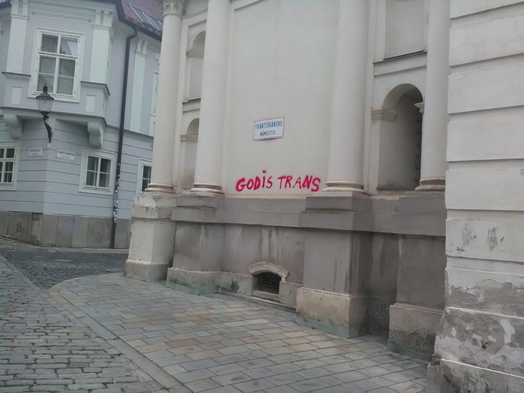 Toto nie je na Slovensku prvý prejav agresivity zo strany transaktivistov voči tým, ktorí s ich rétorikou nesúhlasia. Keď sa ráno 4. augusta 2021 centrum Bratislavy zobudilo, onemelo od úžasu. Na starých kostoloch a historických budovách sa objavili nasprejované drzé až rúhačské nápisy ako „GOD IS TRANS“ (Boh je trans), „TRANS IS BEAUTY“ (Trans je nádhera), či dokonca „QUEER REVOLUTION IS COMING“ (Queer revolúcia prichádza). Takéto a podobné nápisy – niektoré dokonca vyzývajúce k vraždám „transfóbov“ – sa pritom objavujú na miestach po celom západnom svete.