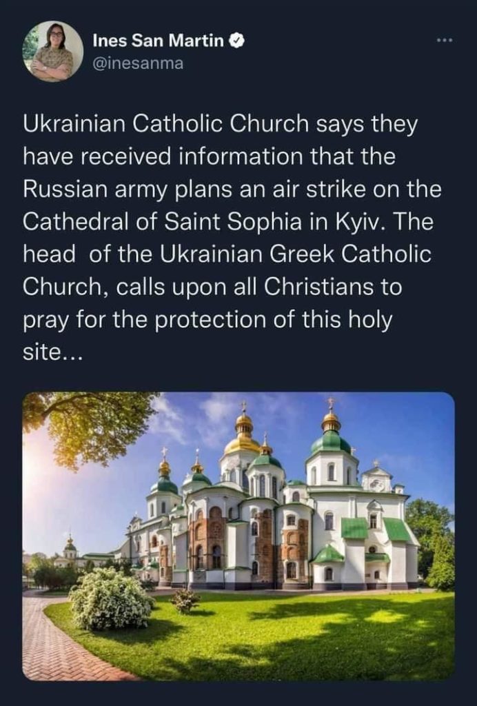 Ukrajinská katolícka cirkev obdržala informácie, že plánuje letecký nálet na katedrálu sv. Sofie v Kyjeve. Hlava ukrajinskej greckokatolíckej cirkvi vyzvala kresťanov, aby sa modlili za ochranu tohto svätého miesta…