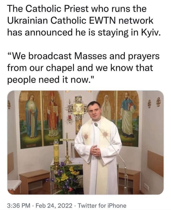 Ukrajinsky kňaz, ktorý vedie ukrajinskú pobočku katolíckej stanice EWTN ohlásil, že ostáva v Kyjeve.“ Hovorí: „Vysielame omše z našej kaplnky a vieme, že ľudia ich práve teraz potrebujú.