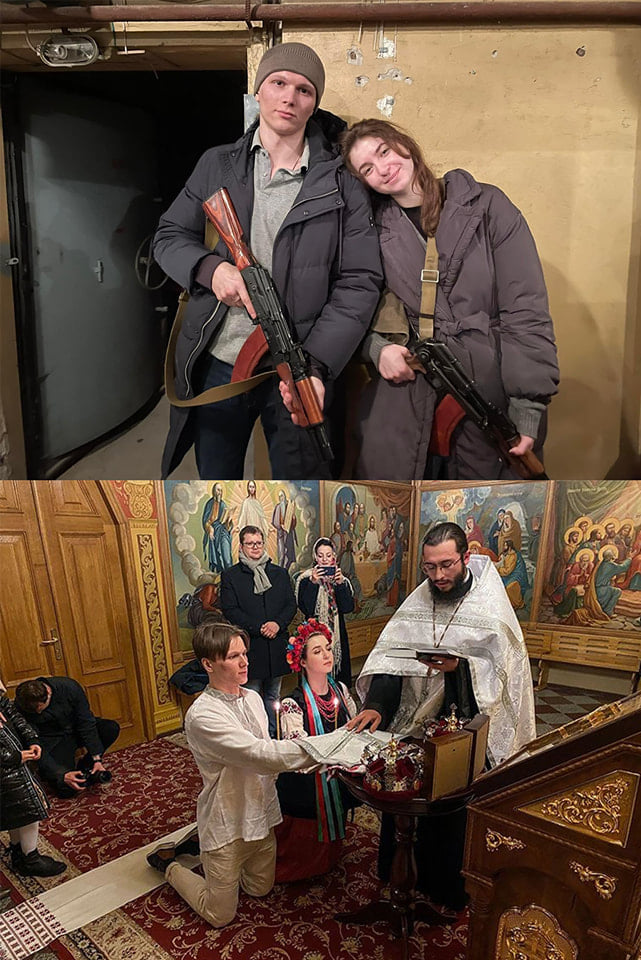 Hoci ortodoxní veriaci, predsa vzor našim mladým: Ukrajinci Jaryna Arieva a Sviatoslav Fursin, neistí svojou budúcnosťou, urýchlili svoju svadbu a zosobášili sa za zvukov sirén oznamujúcich ruskú inváziu.